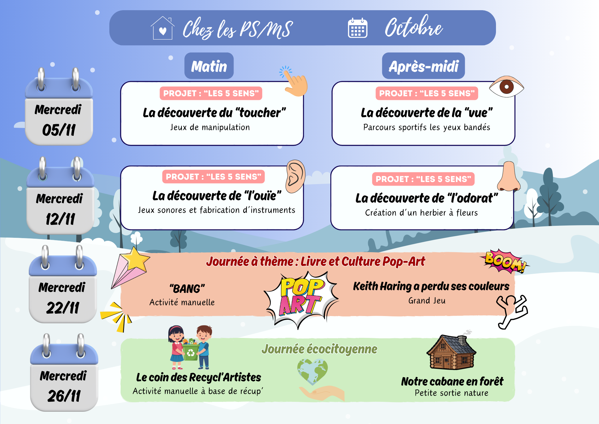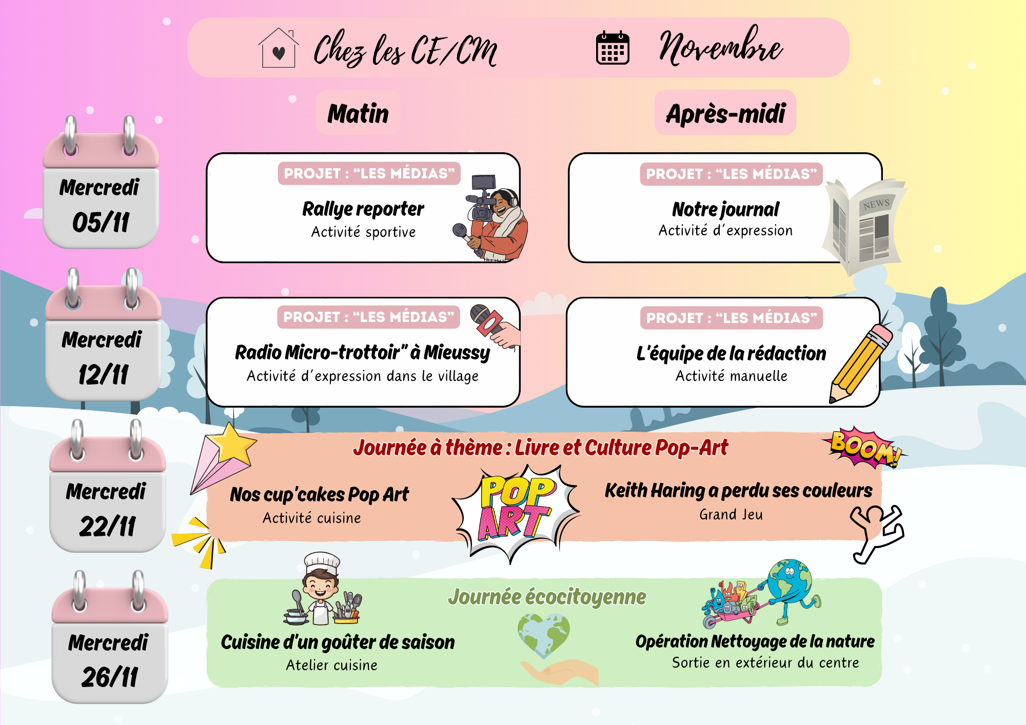 Journée écocitoyenne → Tous ensemble, on agit pour la planète lors d’une journée spéciale préparée par les animateurs.